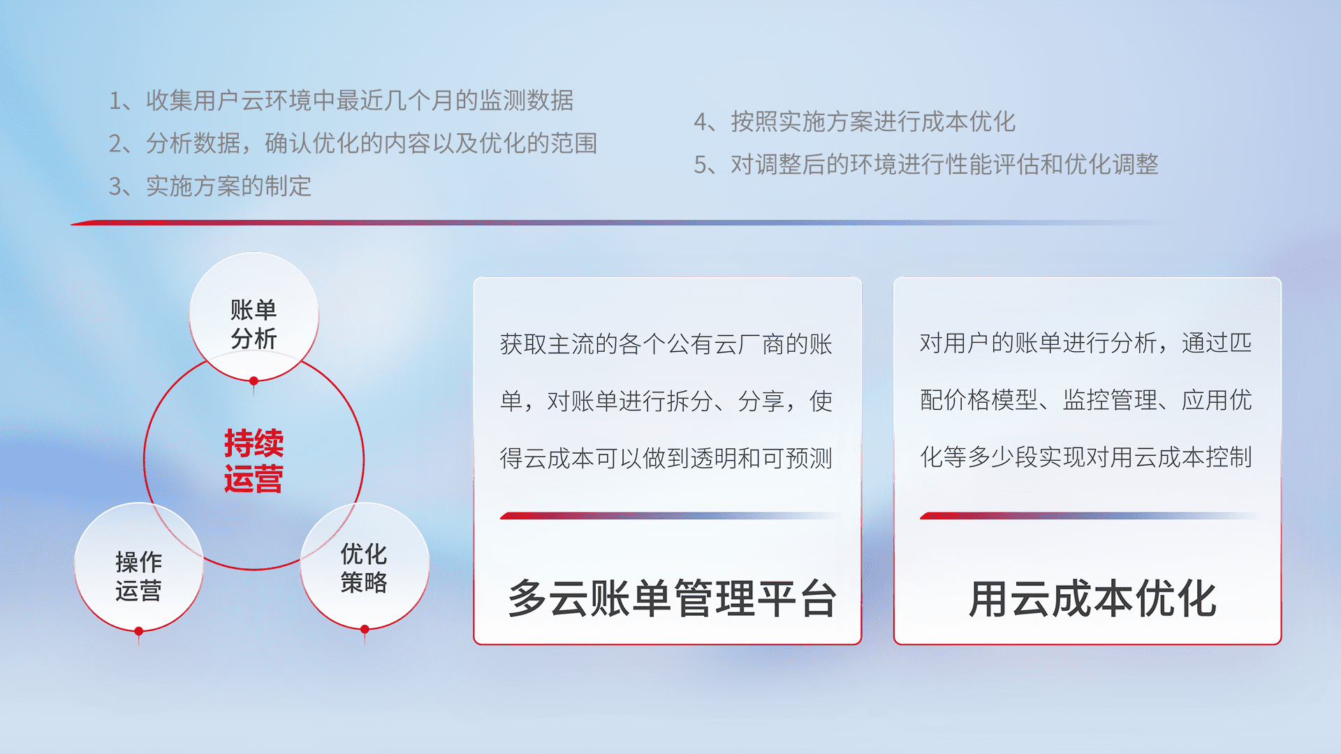通过多云纳管,,以统一的资源数据模型把客户的云资源进行抽象和封装,,,进而实现对多云资源的统一操作,,,保障云资源管理的可靠性、、、稳定性与可用性。。量身定制化运维内容,,配置、、、、开发运维、、、、补丁管理、、备份、、、监控、、、、认证和访问管理、、、、审计和日常巡检等,,,保障在用云过程中的可靠度,,稳定度以及高可用率。。。。
